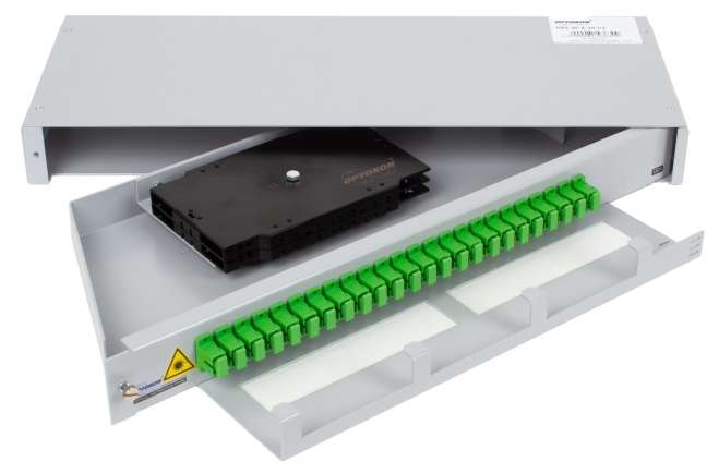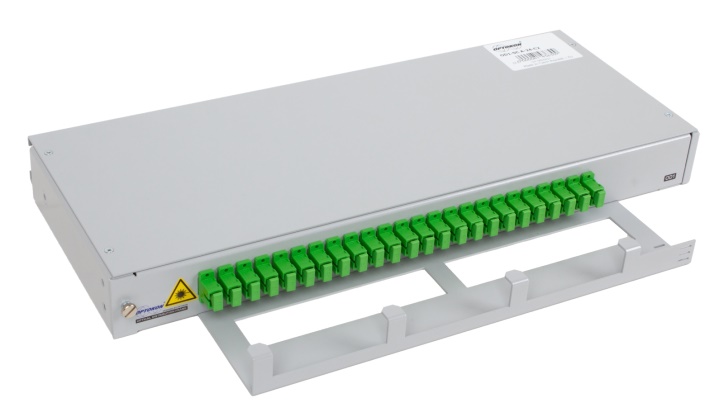 The OD1-E2 pivoting optical distribution frame is an economical rack mountable patch panel for use with splicing of manufactured pigtails, preterminated cables and field-installable connectors. The cables are strain-relieved at the rear of the unit. The pivoting shelf is equipped with a splice tray holder and protection which guides, stores and organizes excess slack. This prevents damage to fibers prior to routing into couplings. The OD1-E2 is used in installations where space is limited.