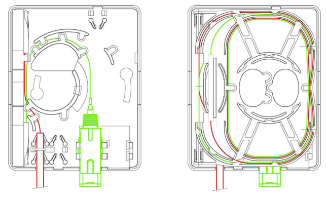 The pictures below present entrance of installation cable to wall outlet and routing of excess cable inside splice cassette and “Cold Splice Protector”.