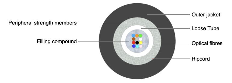 Indoor/Outdoor fiber cable for tidy installation in ducts or on overhead grids.