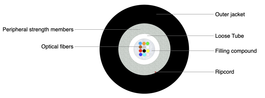 Indoor/Outdoor fiber optic cable with enhanced rodent protection—suitable for installation in ducts or on cable grids.