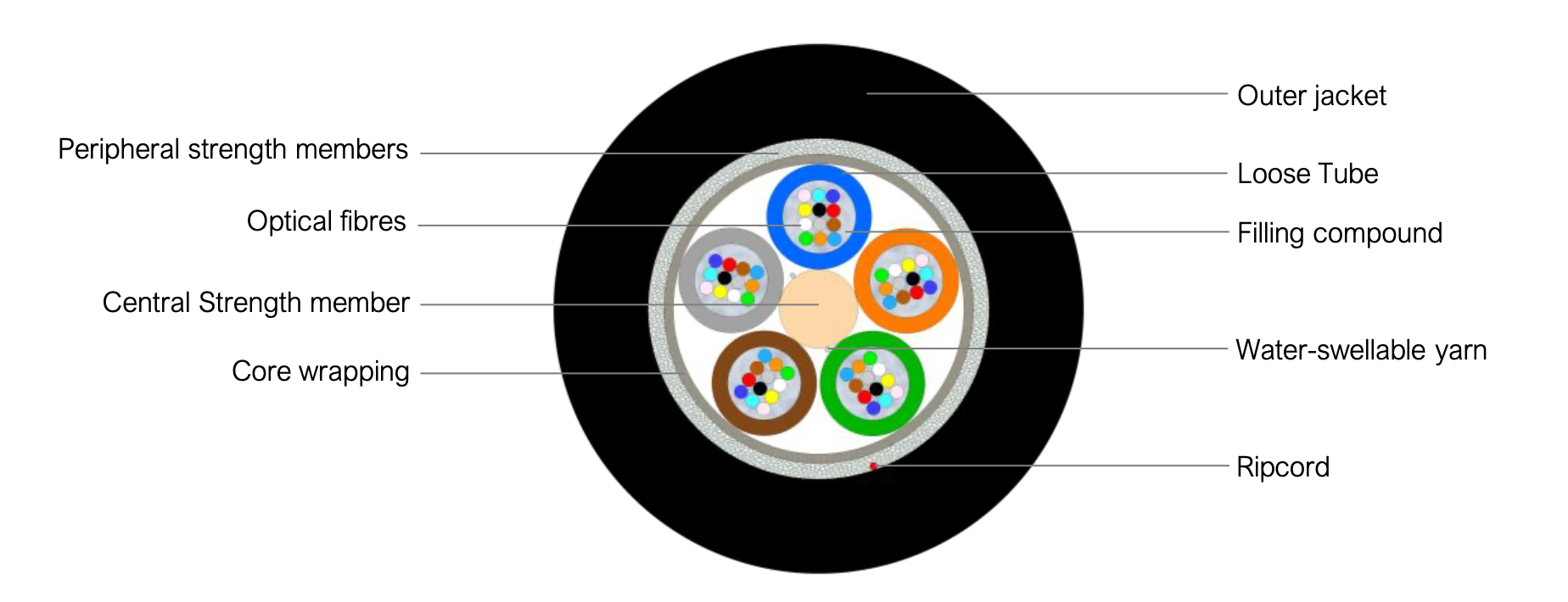 Indoor/Outdoor fiber optic cable with enhanced rodent protection—suitable for installation in ducts or on cable grids.