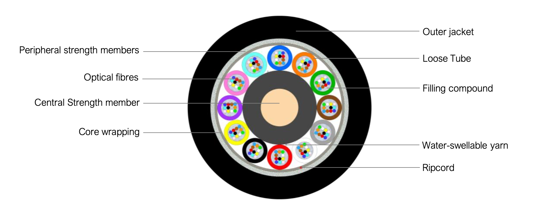 Peripheral strength members Water-swellable glass yarns