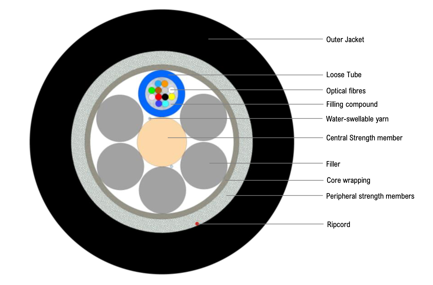 | Peripheral strength members | Double layer of Water-swellable glass yarns |