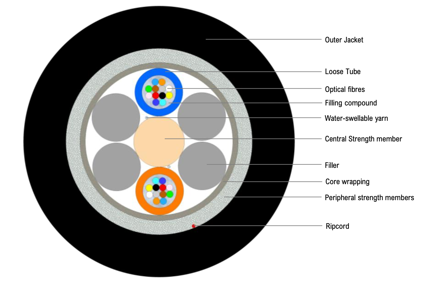 | Peripheral strength members | Double layer of Water-swellable glass yarns |