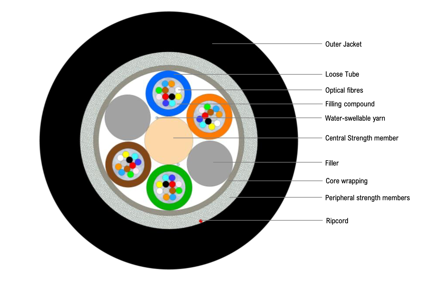 | Peripheral strength members | Double layer of Water-swellable glass yarns |