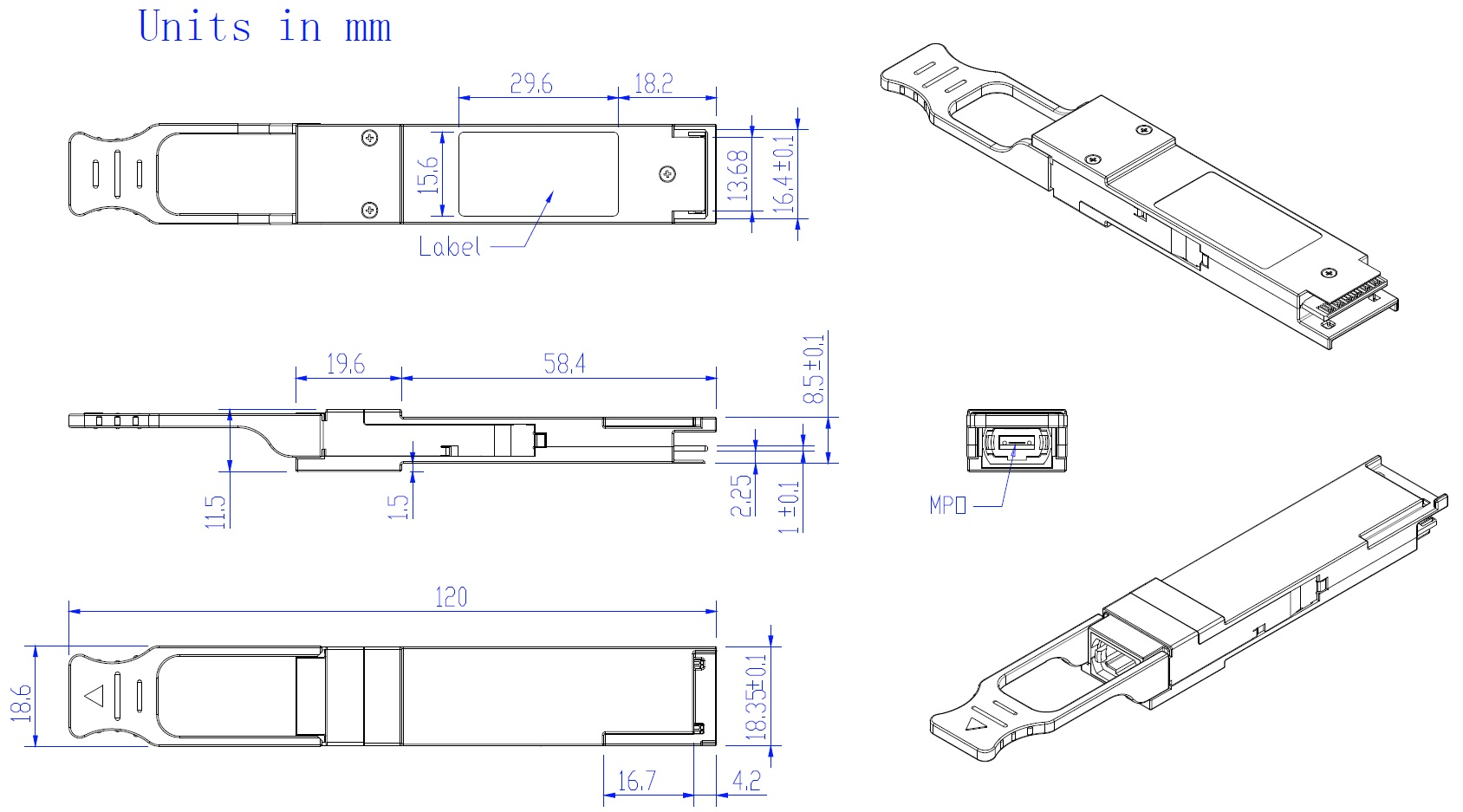 The QSFP28 100GBASE PSM4 transceiver is designed with form factor, optical/electrical connection and digital diagnostic interface according to the QSFP28 Multi-Source Agreement (MSA).