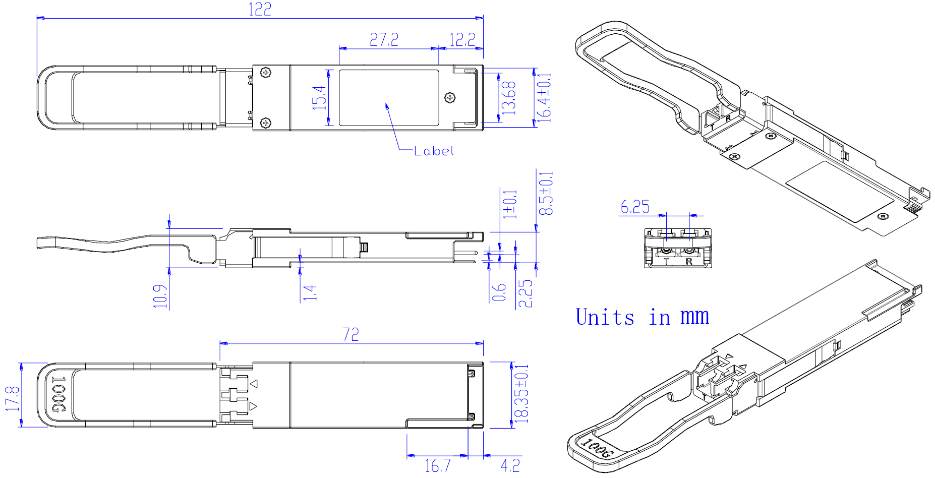 The central wavelengths of the 4 CWDM channels are 1271, 1291, 1311 and 1331 nm. It contains a duplex LC connector for the optical interface and a 38-pin connector for the electrical interface. Single-mode fiber (SMF) is applied in this module.