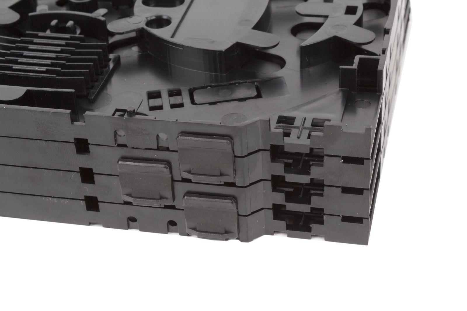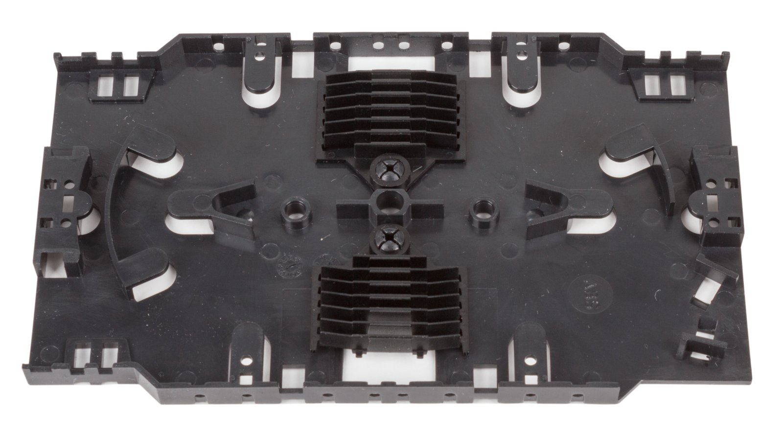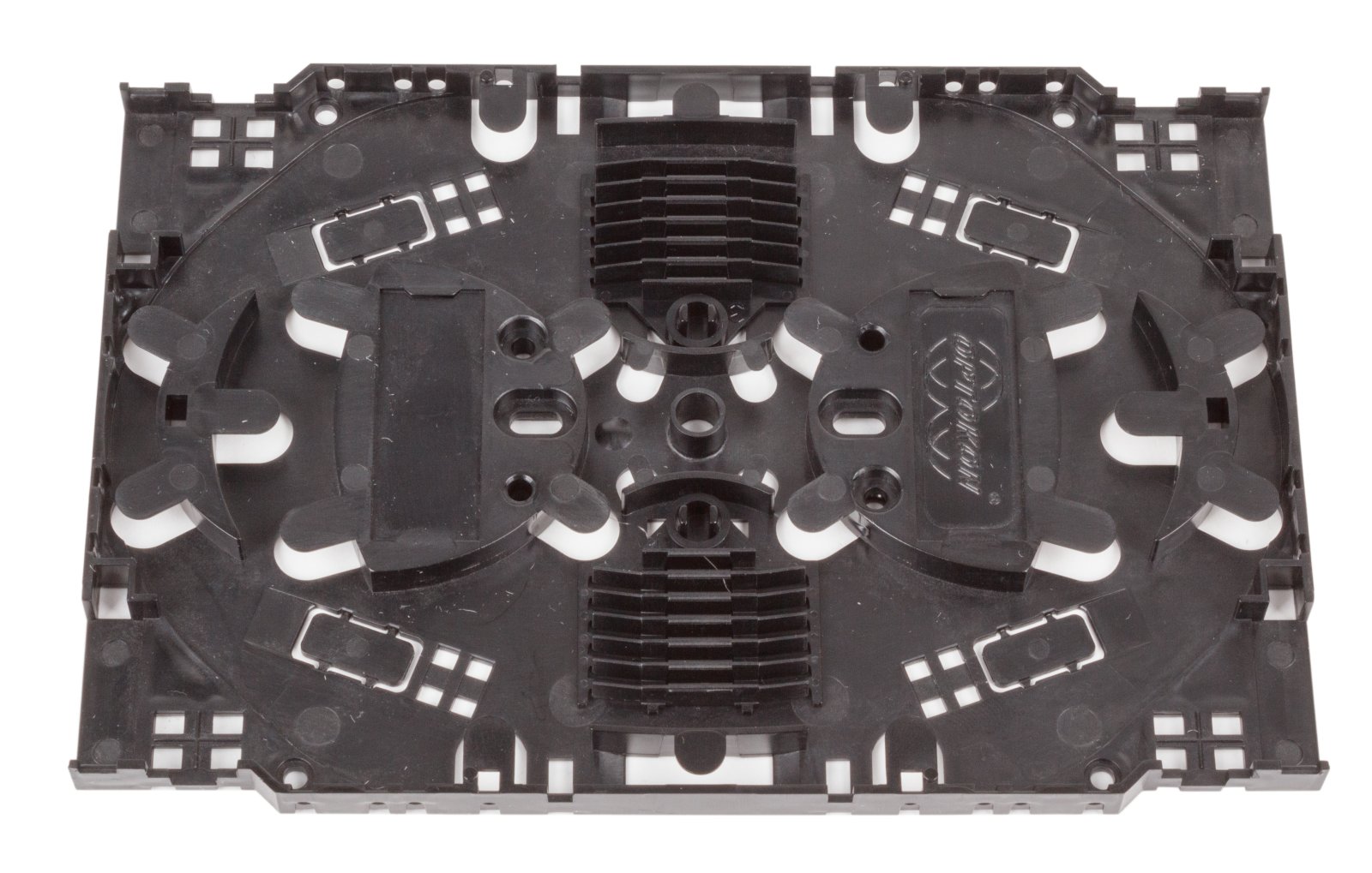 The splice trays are designed for installation into the OPTOKON system of optical rack mount distribution frames and wall mount optical boxes. The splice trays are equipped with fixed internal fiber bend radius protectors, which allow storage and organization of spare fiber, both primary 250 µm and 900 µm coating. The KNS-SH-D splice holders can be used in the splice cassettes, designed for standard heat shrinkable protection sleeves. The capacity depending on outer diameter of protection sleeves after heating is 6 to 12 splices.