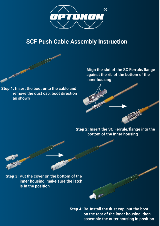 The SCF Push Cable is a concept in pre-terminated optical drop cables for use in connecting the subscriber to the network access terminal. The cable is preterminated with FTTH  SC/APC  "plugging in"  connector, designed for 4 mm indoor tube diameter.