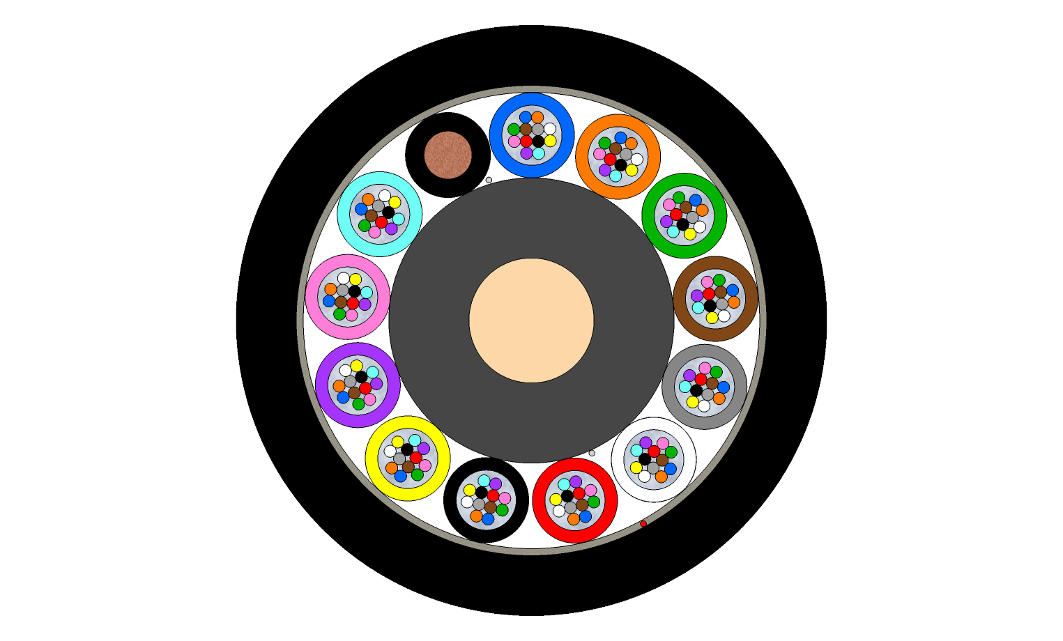 Multitube fibre optic cable for external installation with insulated copper conductor for easy detection of the cable from the surface of the ground above the cable.